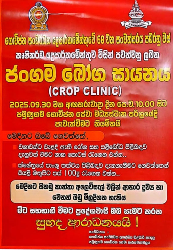 30 වන අගහරුවාදා දින පමුණුගම ගොවිජන සේවා මධ්යස්ථානයේදී බෝග සායනයක් හා පස් පරීක්ෂාවක් නොමිලේ ඔබ වෙනුවෙන් පැවැත්වේ. ඒ සදහා ඔබගේ වගාවන්ට වැලඳී ඇති රෝග හා පළිබෝධ ගැටලු වල සාම්පල් සහ ඔබගේ ඉඩමෙන් වියළි මතුපිට පස් 100g බැගින් රැගෙන ගොවිජන සේවා මධ්යස්ථානයට පැමිණෙන්න
